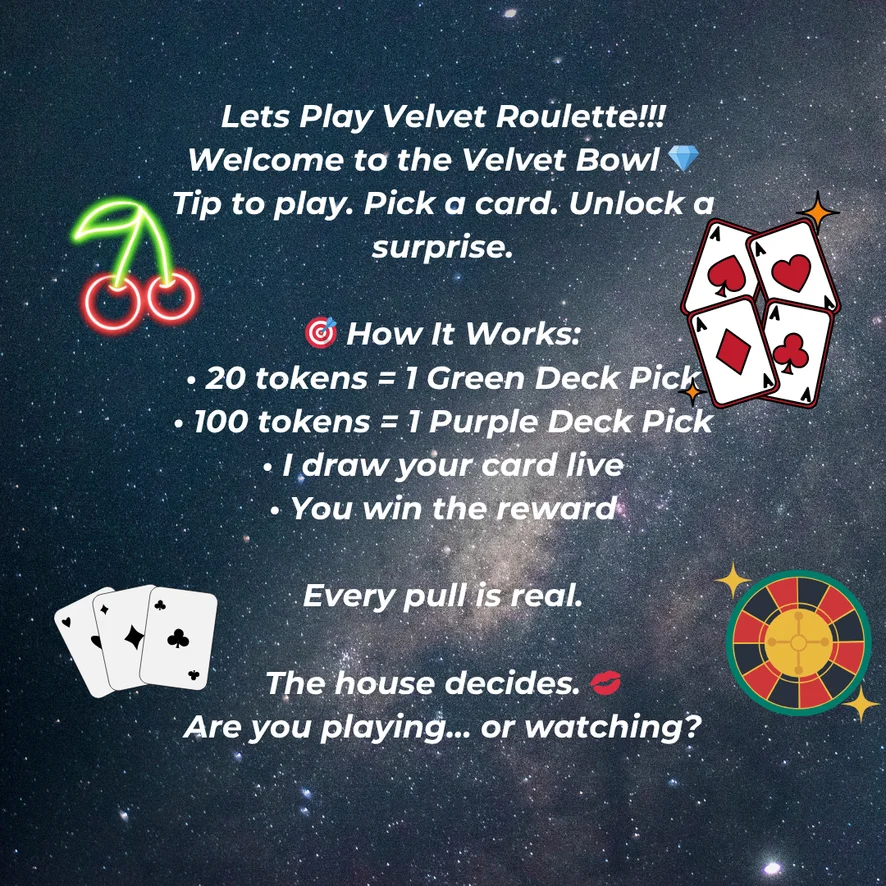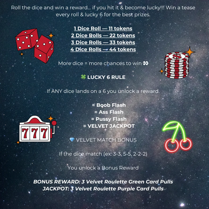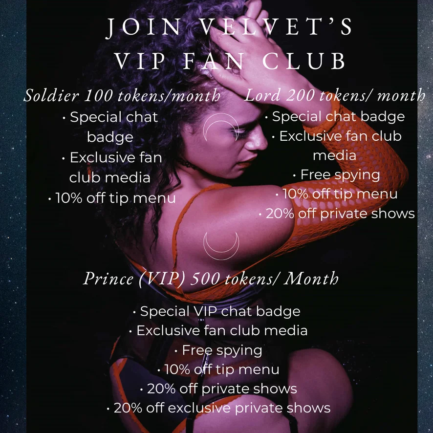 Join Velvet's VIP Fan Club. Soldier, Lord or Prince. |299 tokens=1 solo video| Play Dice & Roulette!